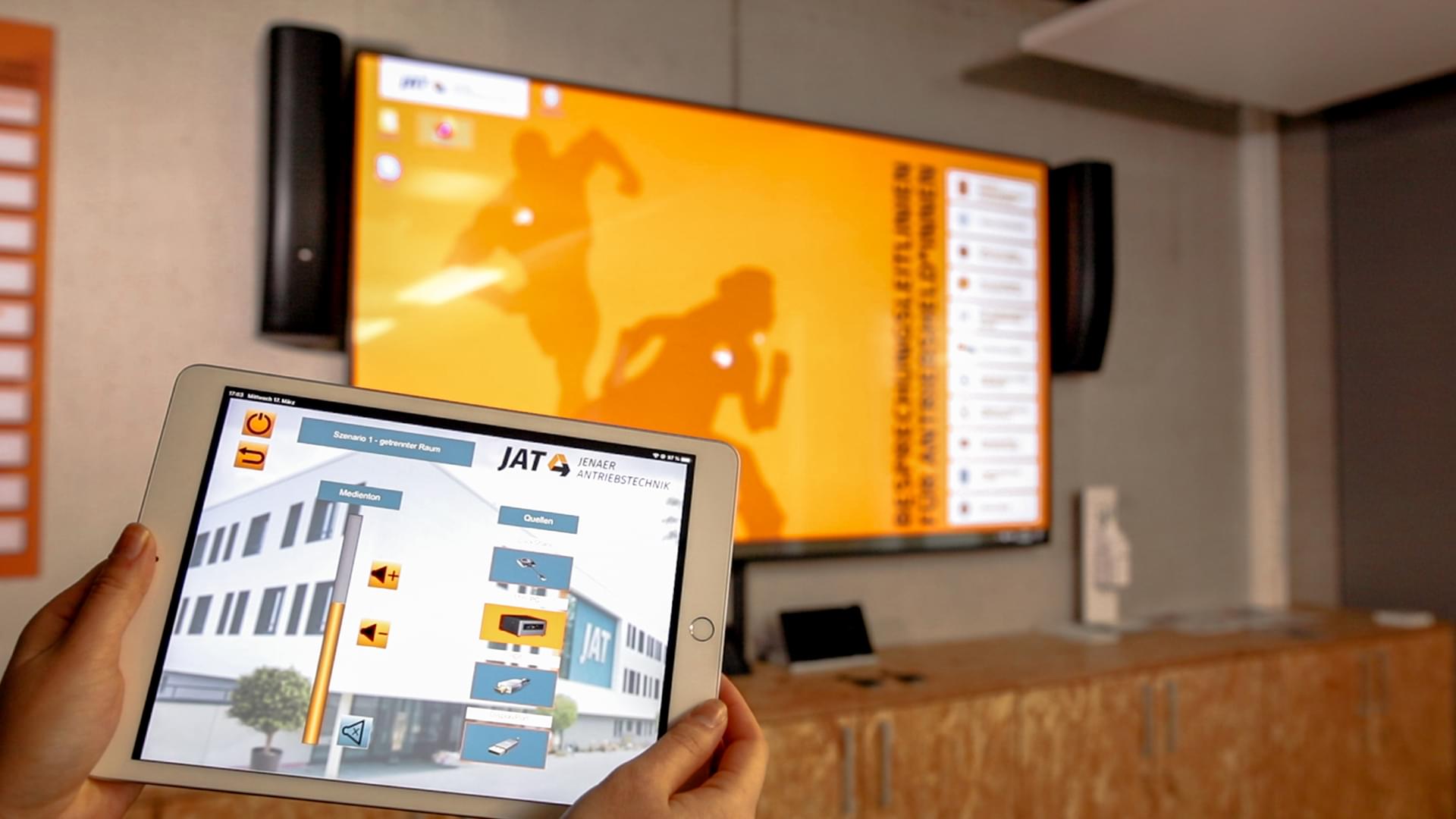 Im Neubau der Jenaer Antriebs-technik GmbH bestand die Aufgabe, einen 15m langen, trennbaren Raum mit einer einfachen und intuitiv zu bedienenden Medientechnik aus-zustatten.