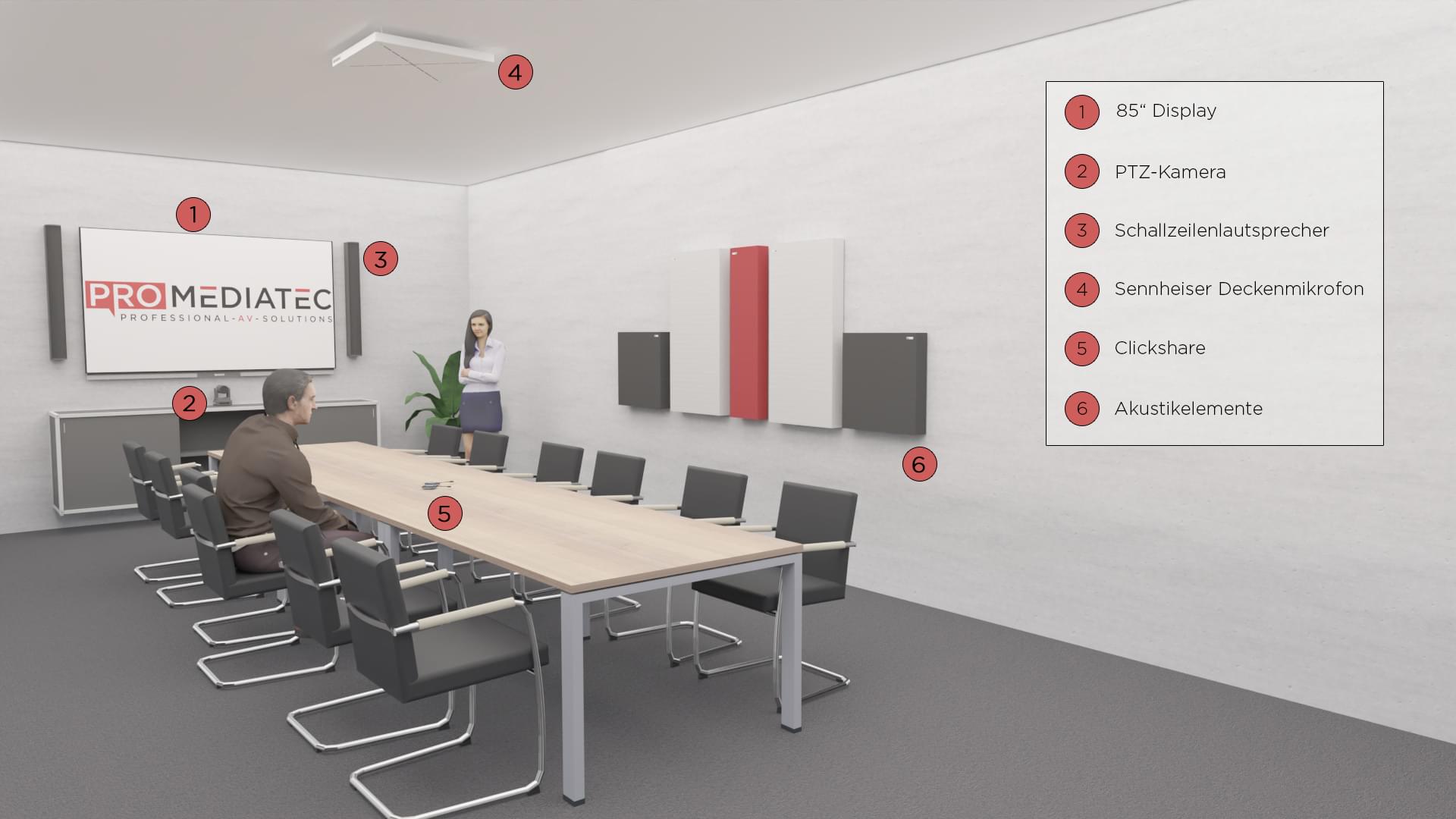 Auf der anderen Seite wollen Sie ihre Konferenzteilnehmer ebenso entspannt verstehen können. Das Lautsprechersystem muss ebenso wie Kamera und Mikrofone an die Raumgröße angepasst werden. Je größer Ihr Konferenzraum, umso leistungsstärker muss Ihr Audio-System geplant werden, um für alle Teilnehmer im Raum ein gutes und gleichmäßiges Klangbild zu ermöglichen. Für kleine Meetingräume reicht oft schon eine Soundbar, für große Konferenzräume werden mehrere Front- und/oder Deckenlautsprecher benötigt.