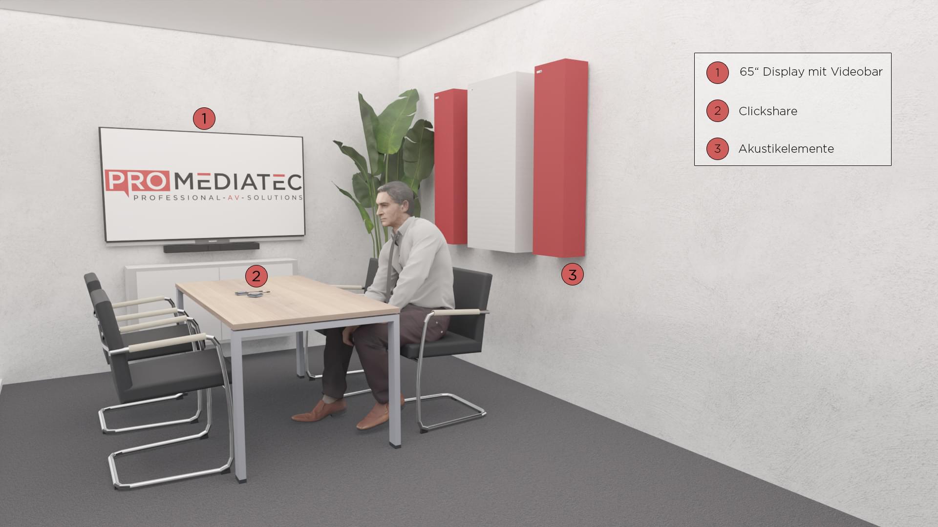 Fest installierte und konfigurierter PCs im Raum ermöglichen den schnellen und einfachen Zugang zur Videokonferenz. Programme sind schon vorinstalliert, per Benutzer-Anmeldung haben Sie Zugriff auf ihre Daten im Firmennetzwerk, sind direkt startklar und ihr Content wird für alle sichtbar angezeigt.